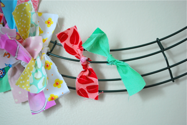 Cortei o pano em tirinhas de 3cmx15cm. Depois fui amarrando no aro da guirlanda, que comprei na Michael’s, por $3,50.