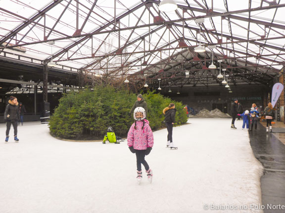 Do lado de fora, adjacente ao prédio principal, há um espaço infantil com atividades e aulas pra as crianças. As meninas não quiseram ir pois estavam doidas pra patinar no gelo. Então nós fomos para o rinque, que fica dentro de um dos galpões. A impressão que temos é de estarmos dentro de uma fábrica mas ao mesmo tempo quando olhamos as árvores bem no meio da pista parece o lado de fora. Nós levamos os patins mas quem não tiver pode alugar lá mesmo.