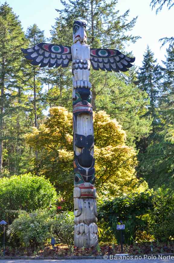 Logo em frente ao pavilhão infantil, estão 2 tótens, muito comum no lado oeste do Canadá.