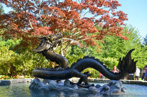 O caminho até o jardim de rosas é marcado por lindas flores, árvores imensas e uma fonte com um dragão,  que veio de Suzhou na China, a cidade irmã de Victoria.