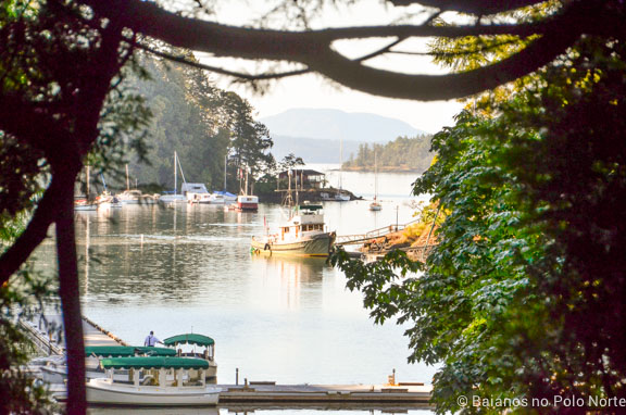 Em alguns pontos do jardim podemos ver os barquinhos na Tod Inlet, uma enseada que parece ter saído de um filme. Quem quiser pode seguir a trilha pelo jardim  japonês e pegar um barco até as ruínas da antiga fábrica de cimento. Esse passeio é pago a parte e nós não fizemos.