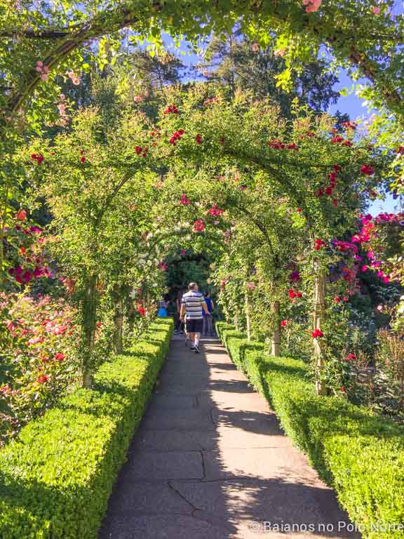 O jardim das rosas é lindíssimo e repleto de espécies de vários países, todas devidamente identificadas. Os canteiros são rodeados por arcos, pérgolas e cantinhos especiais. Achei super romântico caminhar sob as roseiras.
