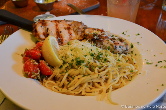 Nessas alturas já estávamos super cansados e entramos no primeiro restaurante que estava sem fila, o Old Spaghetti Factory. Esse não é o tipo de lugar para quem busca pratos elaborados e diferentes. É uma opção mais trivial, com comida farta e em conta. As crianças curtem a comida e a decoração ecêntrica deles. Aqui em Toronto tem um em downtown. O de Vancouver está localizado no 55 Water Street.