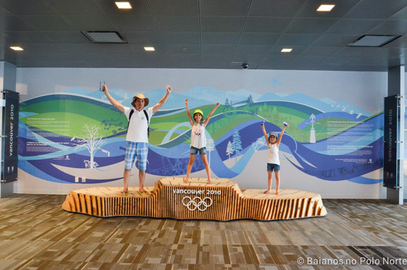No dia que fomos não tinha nada especial acontecendo então demos uma voltinha rápida, entramos no prédio para ver a pequena exposição sobre as Olimpíadas de Inverno (free) e caminhamos pela Canadian Trail, uma calçada com o nome de todas as províncias e algumas cidades do Canadá. As meninas adoraram procurar os nomes dos lugares que já conheciam.