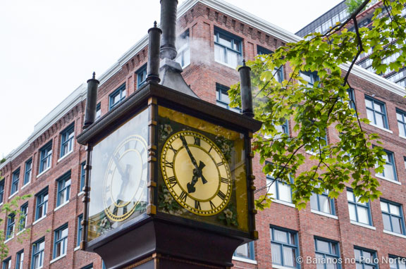 Mas além do seu charme e história, ele tem outra coisa que atrai muitos turistas, um relógio a vapor. Guardadas as devidas proporções, ele me lembrou a torre do Big Ben, em Londres. No topo do relógio há apitos que liberam o vapor tocando a melodia Westminster Quarter, igual a do Big Ben. Só que ao invés de sinos, ouvimos um som suave que parece uma flauta. O relógio de Gastown apita a cada 15 minutos. Ele fica na esquina da Cambie St. com a Water St.