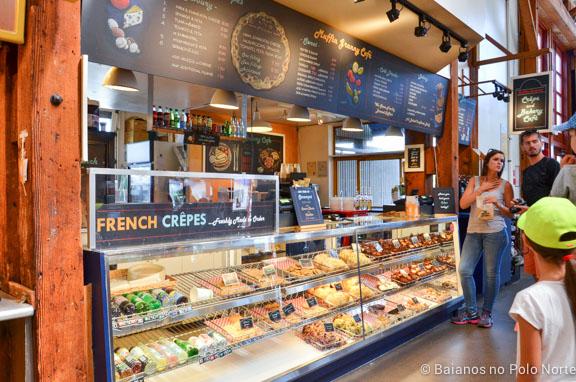 Acordamos cedo e fomos tomar café no mercado municipal em Granville Island (granvilleisland.com). Essa é uma antiga área industrial da cidade que foi revitalizada e tornou-se um destino gastronômico, cultural e de compras. Sem dúvida, nós fomos pela comida!