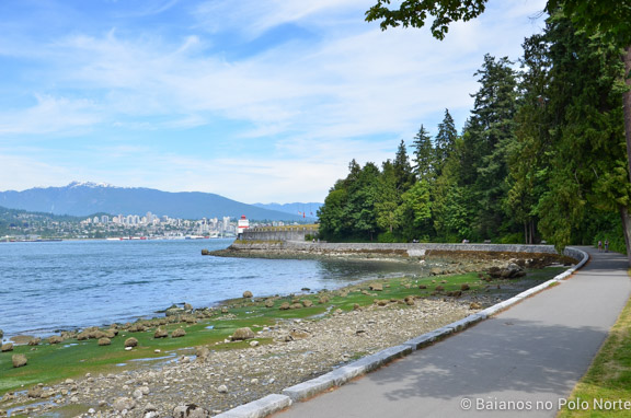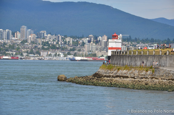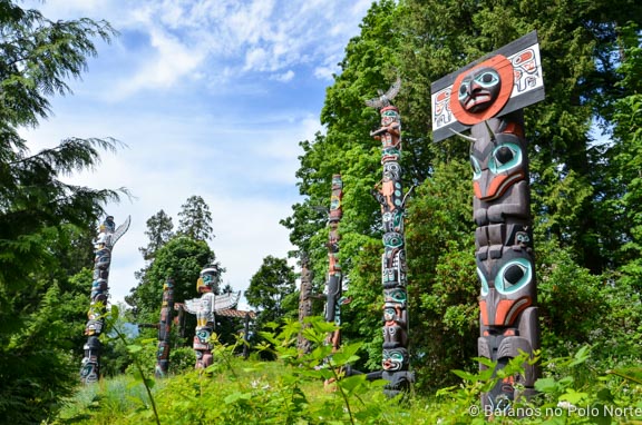 Começamos a explorar Vancouver pelo belíssimo Stanley Park, um parque urbano, localizado bem no centro da cidade. Ele possui diversas atrações, como aquário, jardins, totens e trilhas. Caminhamos por parte da Seawall, que é uma trilha pavimentada ao redor de todo o parque, com vistas incríveis da cidade e montanhas. Não percorremos o caminho inteiro, que demora em média 3 horas a pé e 1 hora de bicicleta. Fizemos o comecinho dela a pé, até os totens. Quem tiver mais tempo pode fazer o passeio de trem pelo parque ou alugar uma bicicleta.