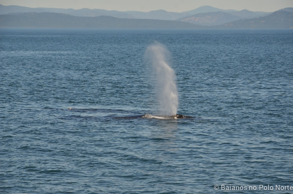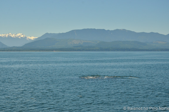 Depois de passarmos um tempo observando os animais da ilha, seguimos pelo estreito Juan de Fuca e avistamos a primeira baleia jubarte ali pertinho. Não ficamos muito tempo acompanhando essa jubarte pois o capitão recebeu a notícia pelo rádio que havia um casal de jubarte mais ativas, logo adiante.