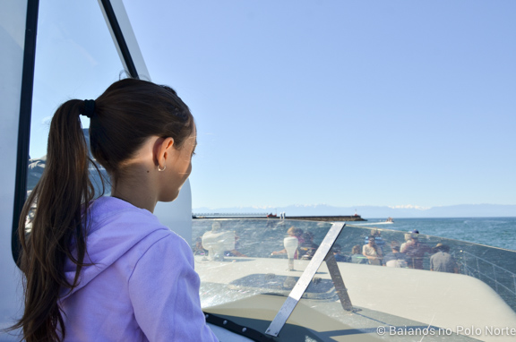 Ficamos com medo de ir no barquinho aberto por causa das meninas e escolhemos o fechado, ou melhor, semi fechado. Digo isso porque os catamarãs possuem a parte interna climatizada, com cadeiras confortáveis, banheiros e prateleiras para guardar nossos pertences. Mas quem não quiser ficar dentro pode sair, andar pelo lado de fora e até subir na parte de cima, onde fica o capitão. A gente ficou lá em cima com o capitão o tempo inteiro, ou seja, dava para ter ido no barco aberto sem problemas.