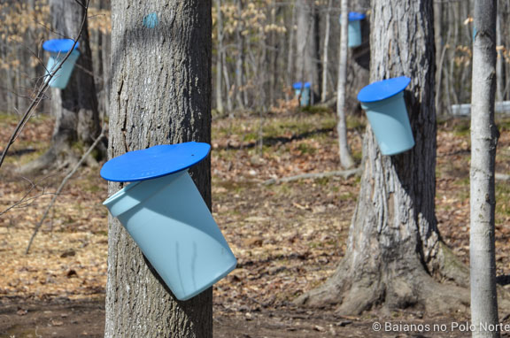 Assim que cruzamos a placa, já vimos os baldes presos nas árvores, que é como a seiva do bordo era extraída originalmente.