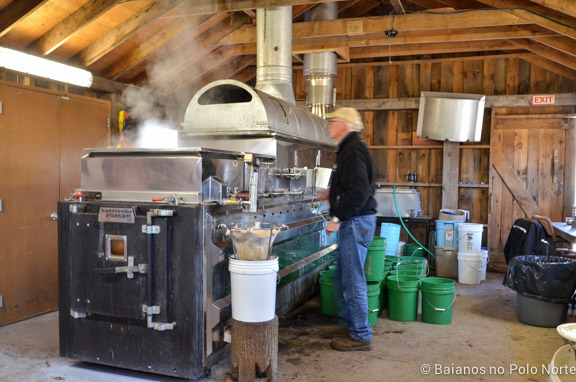 Em outra, um senhor simpático mostra como é a caldeira usada para ferver a seiva do bordo até que ela se transforme em maple syrup.
