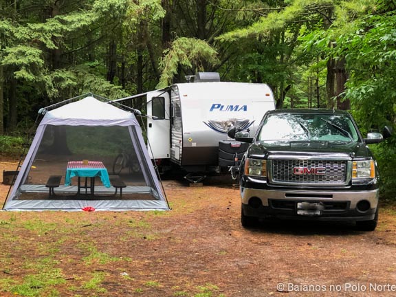 A área de camping tem 3 zonas, nós ficamos na do meio, chamada Leander Campground e demos sorte pois era perto do anfiteatro e do playground para as crianças. Para quem nunca acampou em Ontário, os sites são numerados e dá para ver as fotos no site do Ontario Parks. Antes de reservar recomendo olhar essas fotos pois alguns locais eram pequenos e sem árvores ao redor. O que nós ficamos era bem grande e cercado de árvores (número 163).