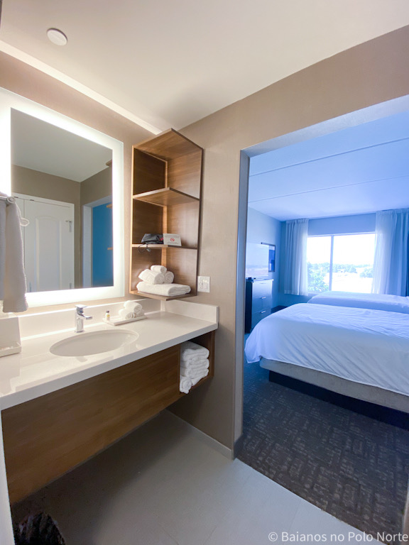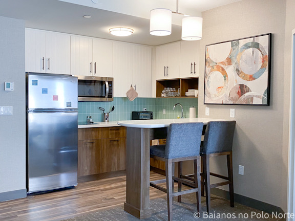 Todos os quartos possuem cozinha com geladeira, microondas, fogão, máquina de lavar louças, torradeira, cafeteira e utensílios. Perfeito para quem viaja com crianças ou vai ficar hospedado mais tempo. Diferente do vizinho Holiday Inn, que tem quarto sem cozinha.