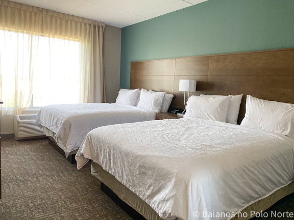 O hotel tem suites com 1, 2 quartos e studio. A nossa tinha 1 quarto com duas camas queen e sala com sofá cama. O tamanho do quarto é bem confortável e a cama também!