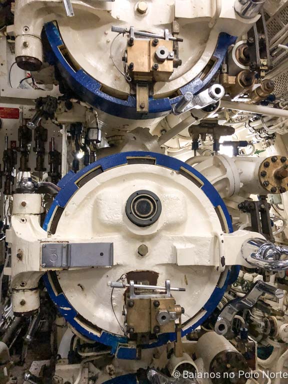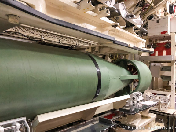 O submarino carregava um total de 24 torpedos de 5.8m, com um alcance de 5 milhas. O nosso guia abriu a cápsula de lançamento e explicou como funcionava. Acoplado à cápsula, há um dispositivo de segurança (parece uma caixinha) para evitar que algum desavisado abra a escotilha e inunde o submarino. Sim, isso já aconteceu, e a válvula só foi criada depois disso.