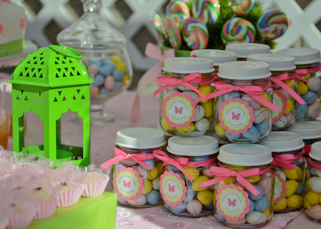 O enfeite da piruliteira, as flores e borboletas do painel também foram compradas na lojinha de 1 dólar. Os pirulitos coloridos e os papéis de scrapbook para as etiquetas foram na Michaels.