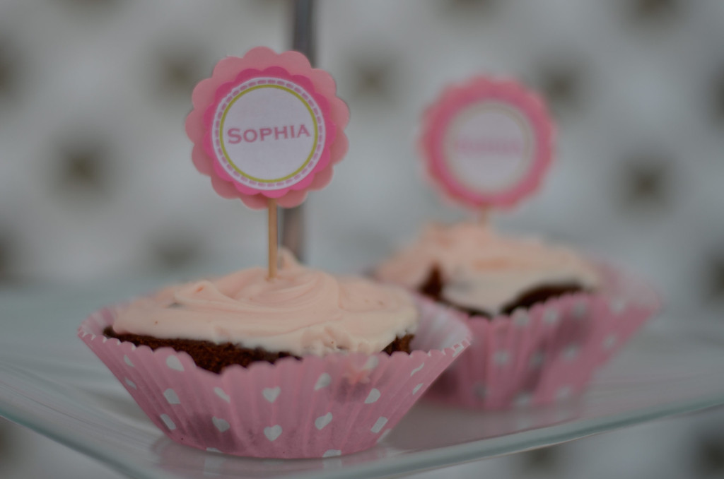 As florzinhas de papel personalizadas que usei para enfeitar os cupcakes e as surpresinhas também foram feitas por mim. Fiz o desenho no Illustrator e cortei com esse furador de papel em forma de flor(se alguém gostar e resolver comprar usa esse link que eu ganho uma pequena comissão). A proprósito, se precisarem de etiquetas e convites personalidados estou a disposição, faço um precinho camarada para os leitores do blog. 😉