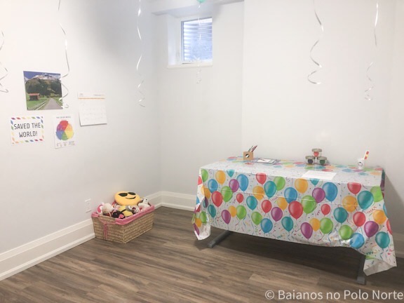 Ao todo eram 10 crianças para brincar, então dividi em dois grupos e fiz duas escape rooms. Imprimi duas cópias do kit, cortei e escondi em lugares fáceis como dentro do closet, embaixo da mesa, no meio de revistas, na caixinha com bichos de pelúcia, etc. Se você não quiser esconder, pode arrumar tudo em cima da mesa para as crianças resolverem. Nós achamos mais divertido esconder. Como vocês podem ver, a decoração foi bem simples.