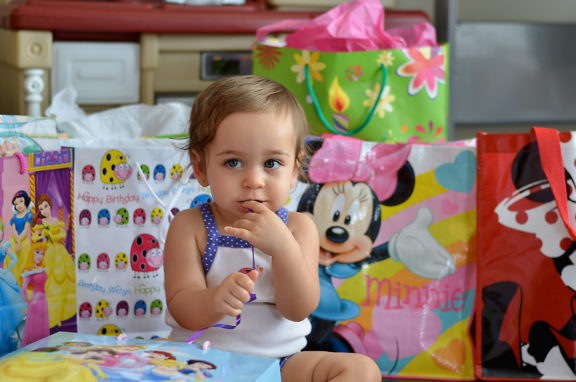 O único aniversário que fiz festão foi o de 1 ano da minha primeira filha (foto acima). Nós fomos comemorar com a família no Brasil e acabamos entrando no esquema buffet, decoração profissional, garçons e a família inteira. No final, gastei uma nota, achei um stress e a Elena não se divertiu nada. Nunca mais!