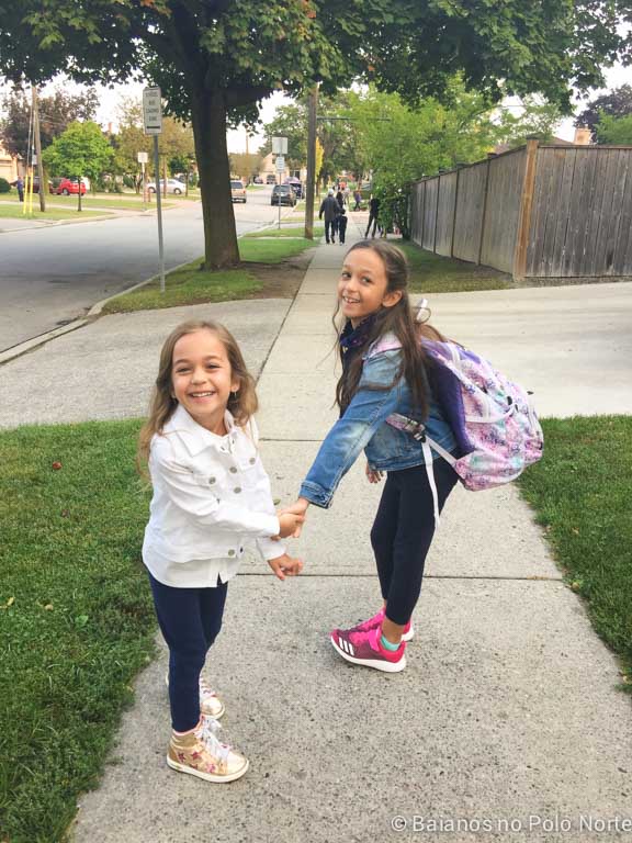 O horário das elementary schools aqui é das 8:30h às 15h, mas a maioria das escolas da cidade começam às 9h e terminam às 15:30h. Exceto pelos alunos do JK (Junior Kindergarten), todos os outros ficam no período integral desde o primeiro dia.