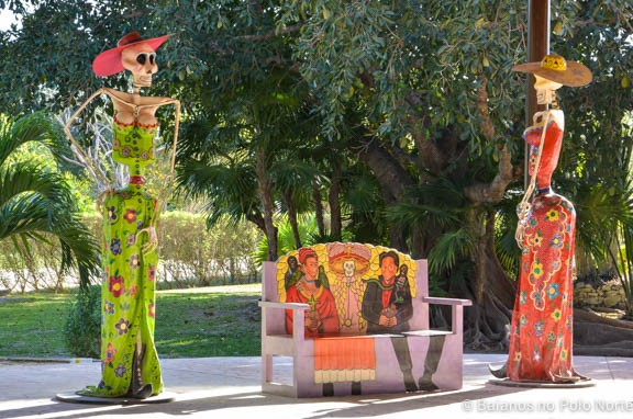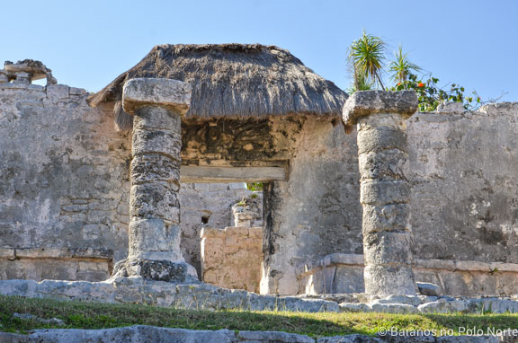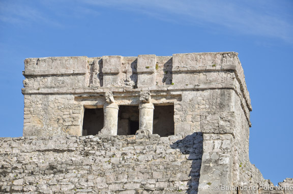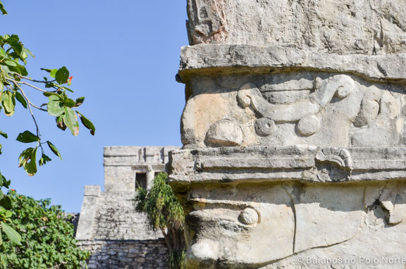 Por causa da sua localização privilegiada, Tulum era um polo comercial muito importante. Além disso, era também um centro religioso. Dá para ver várias esculturas que representam deuses, como esse de perfil aí na foto.