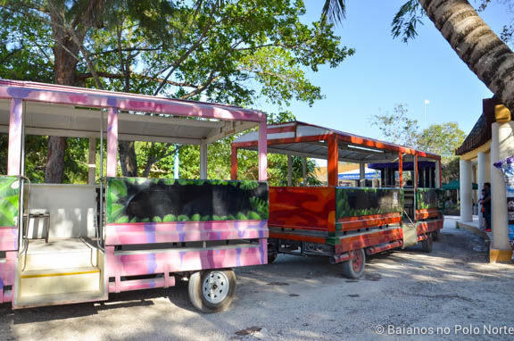A entrada para as ruínas de Tulum fica a uns 800 metros da praça principal onde estão as lojas. Algumas pessoas fazem o caminho a pé, outras vão numa espécie de trenzinho ($20 pesos por pessoa, ida e volta). Com crianças é muito mais divertido (e menos estressante) a segunda opção.