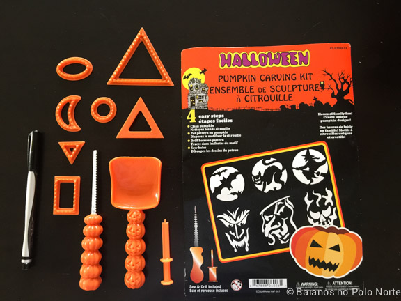 - 1 pumpkin carving kit – quem não quiser comprar, ou não achar, pode usar 1 faca pequena de serra, 1 objeto com ponta fina tipo um prego e 1 colher grande