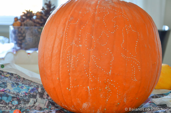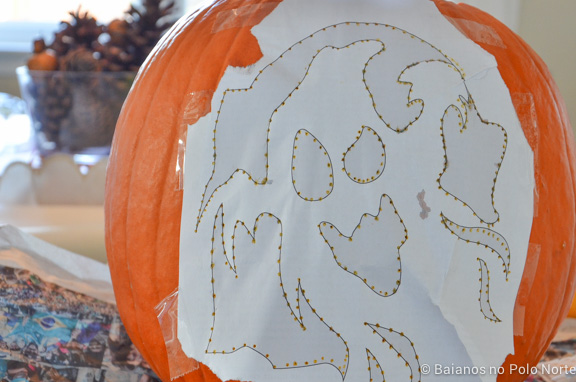 Quando acabar de traçar, retire o molde. A abóbora vai ficar cheia de furinho e aí é só cortar ao longo das linhas. Se tiver dificuldade para enxergar, passe farinha de trigo ou maizena nos buraquinhos.