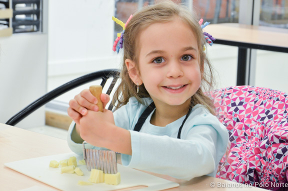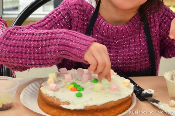 A festa é conduzida por duas instrutoras. Assim que as crianças chegam elas ganham um avental e chapéu de chef, que elas podem personalizar com lápis de cor.