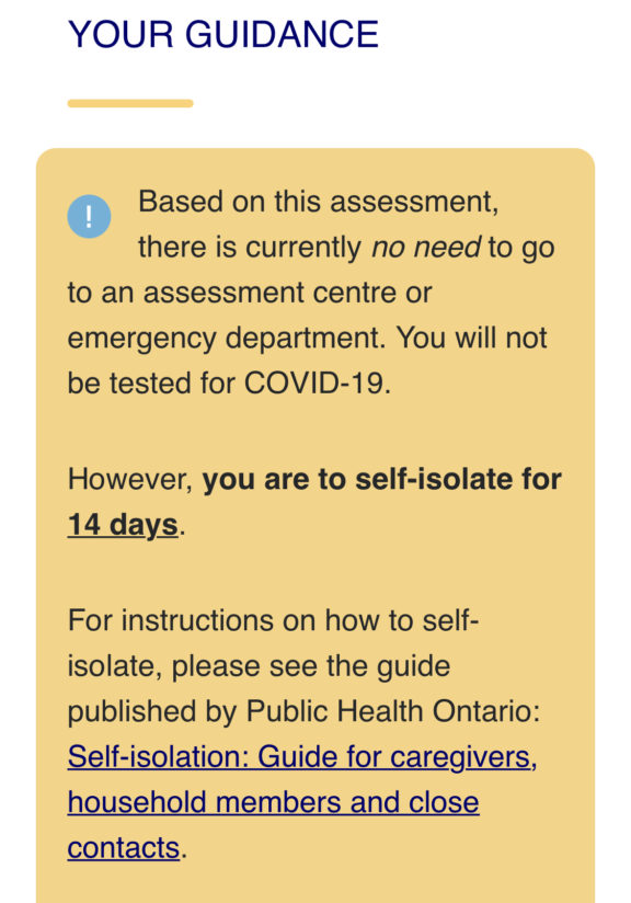 Se você está na dúvida quanto a necessidade de fazer um teste, os órgãos de saúde colocaram uma espécie de triagem online, onde cada um responde umas perguntas e de acordo com as respostas, o site recomenda o que fazer. Em Toronto é esse aqui.