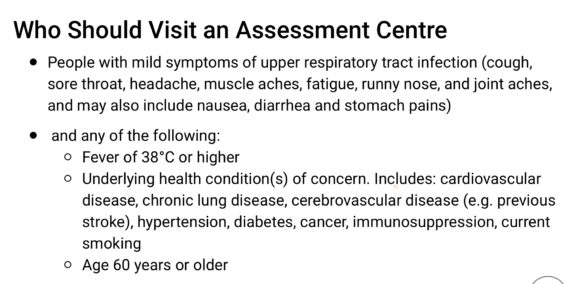 No Canadá todas pessoas que tem sintomas de COVID-19 estão sendo orientadas a entrar em contato com o seu médico de família ou o departamento de saúde, antes de se dirigir a um COVID-19 assessment centre. Os sintomas estão listados no site do Ministério da Saúde canadense.