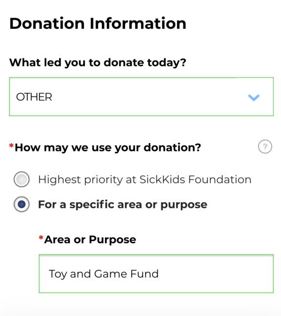 Outra forma de contribuir é fazendo uma doação de qualquer quantia para o Toy and Game Fund. Até $5 ajuda! Para doar visite o site SickKids Foundation, selecione a opção DONATION na parte superior da tela e o tipo de doação que deseja fazer (mensal, anual ou uma vez). No final você pode escolher se sua doação irá para o Toy and Game Fund ou para qualquer área que esteja precisando.