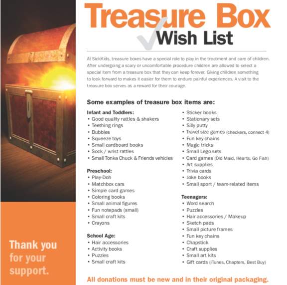 No site do Sick Kids tem sugestões de presentes e itens mais desejados, em cada faixa etária. Há uma carência de itens para bebês e adolescentes, além de coisas pequenas como massa de modelar, Hot Wheels e adesivos. Essas coisinhas geralmente são usadas para acalmar ou recompensar as crianças após um exame ou procedimento médico.