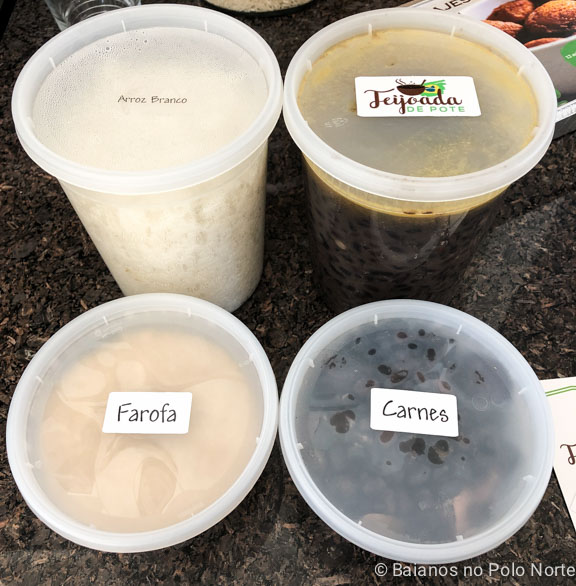 Também tivemos a oportunidade de provar da feijoada de pote, que vem separada em 4 vasilhas. Feijão, carnes, arroz e farofa, humm! É só esquentar e servir, ou congelar para comer depois. Super prática e ideal para os dias que a gente não tem tempo ou vontade de cozinhar. A porção de 32oz deu para nós 4 e ainda sobrou. Simplesmente divina!