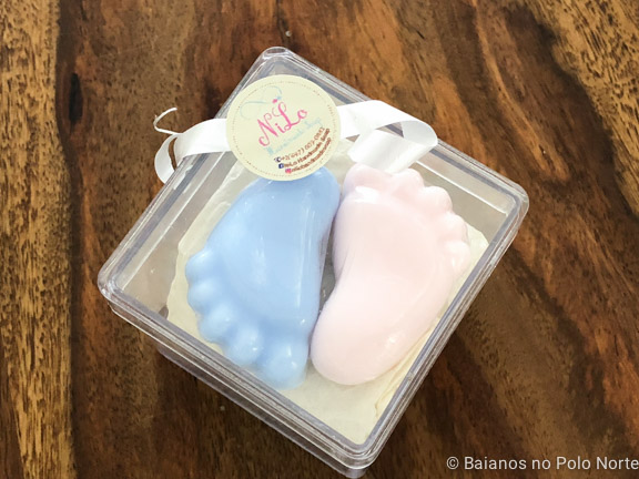 Nós fomos presenteados com uma caixa personalizada, que reflete a nossa família. A Carol perguntou o que as minhas filhas gostavam, se tínhamos bichos de estimação e o resultado foi uma caixa com sabonetes em formatos de meninas, dois ursos representando os pais, cupcakes, unicórnios, sereia, flor roxinha com cheiro de lavanda e até o nosso gatinho. Tudo ficou pronto em 1 semana.