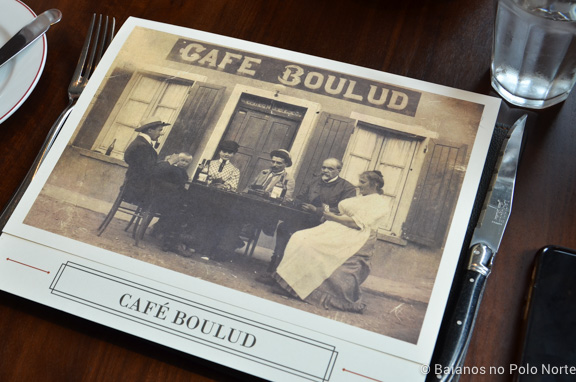 Esse menu tem uma foto antiga na frente e é cuidadosamente impresso diariamente, lá mesmo no hotel.