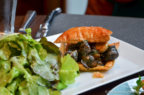 De entrada pedimos o Escargot ($21), que vem com uma salada e massa folhada bem gostosa. Foi a primeira vez que provei e achei bem gostoso, parece bastante o champignon.
