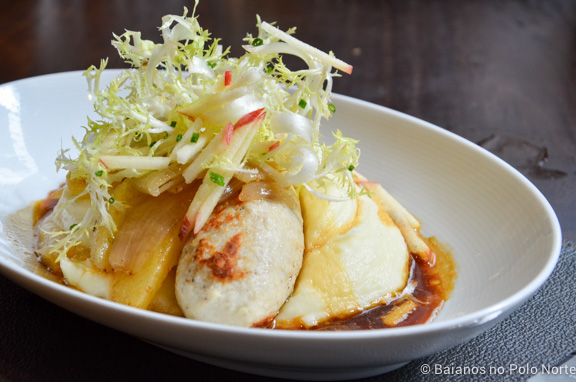 Eu pedi o Boudin Blanc ($28), que vem com uma chouriça de porco branca que derreteu na minha boca, purê de batatas, cebola caramelizada, maçã grelhada e uma saladinha. Essa combinação do salgado com o adocicado da maçã foi perfeita! Esse é um prato sazonal, disponível apenas no outono.