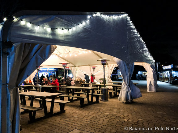 Não contei quantos, mas haviam inúmeros food trucks, servindo vários tipos de lanches. No meio dessa área há uma tenda com aquecimento, onde podemos sentar para comer. Vi também uma lojinha vendendo tortas inglesas.