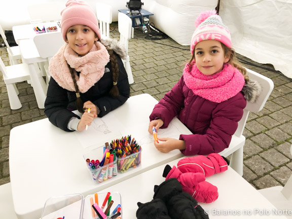 Quando saímos dos mundos encantados em direção ao Santa Workshop encontramos uma área dedicada para crianças, com mesas e desenhos para colorir. Ideal para as crianças menores descansarem um pouco. A tenda fica meio escondida. Nós fomos os primeiros a visitar o local, pois até aquele momento ninguém tinha visto. Curiosamente ele não está no mapa.