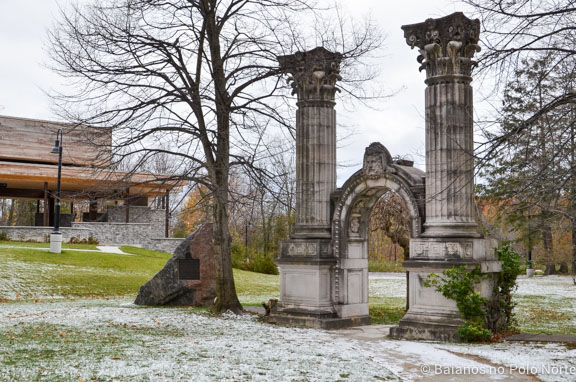Na época do crescimento pós guerra, diversos prédios foram demolidos para darem lugar a novas construções. E na tentativa de preservar a herança arquitetônica de Toronto, os Clarks começaram a salvar pedaços desses prédios. E são esses pedaços que fazem esse parque ser tão marcante hoje, especialmente as colunas gregas, do antigo Bank of Toronto (foto lá no início do post).