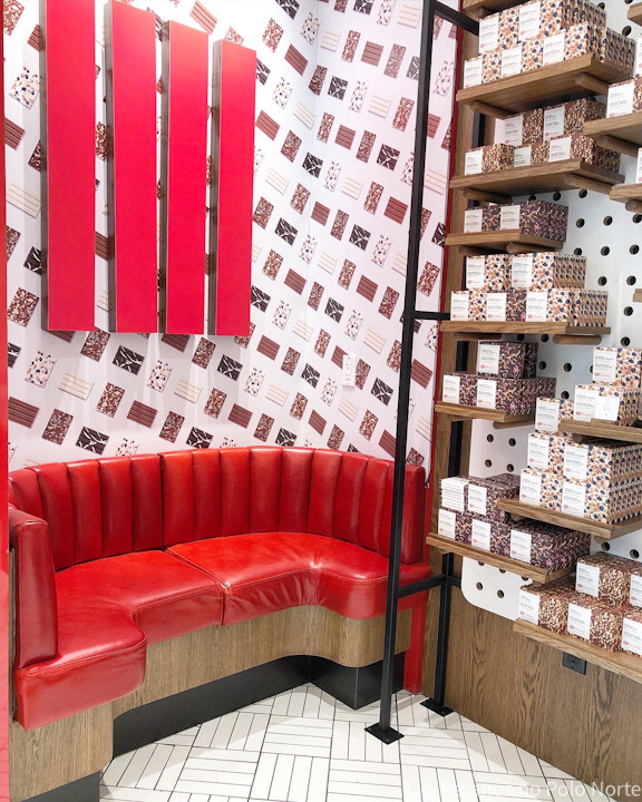 A loja não é muito grande mas é bem bonitinha. Se ninguém me dissesse o que vendia na Chocolatory, eu conseguiria descobrir por causa da decoração com toques de vermelho e madeira. Em minha opinião tem tudo a ver com os KitKats. Do lado direito de quem entra, está o local onde os chocolates são preparados. O espaço é aberto e dá para ver todo o processo desde a colocação dos biscoitos no molde até a finalização com os ingredientes que escolhemos. E o cheirinho bom que fica lá dentro…hummm.
