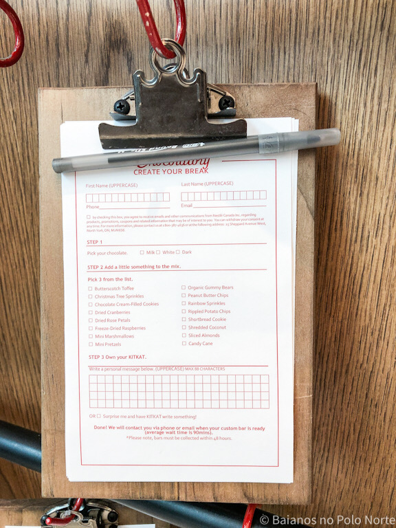 Quando entramos na loja, tem umas das pranchetas penduradas do lado esquerdo, basta pegar uma delas para começar a criar o seu chocolate personalizado. No formulário, marcamos o tipo de chocolate, que pode ser branco, ao leite ou meio amargo.