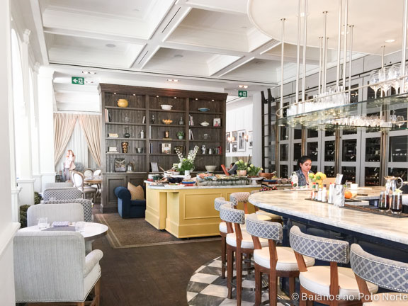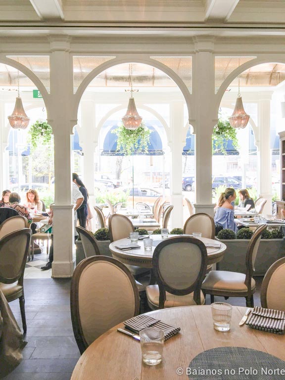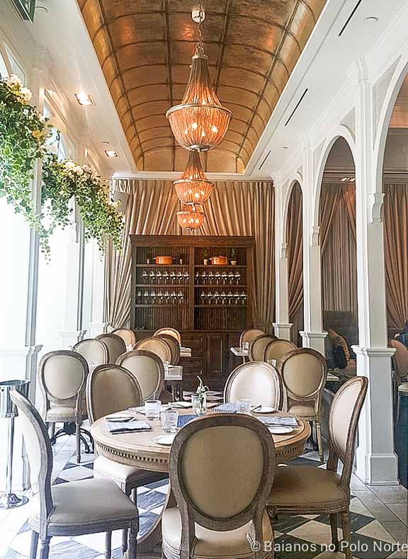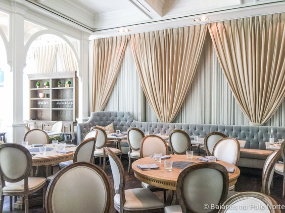 À esquerda está o restaurante, com uma sala de jantar super charmosa, cortinas compridas, pé direito alto, chão de madeira e coffered ceiling (não lembro como se chama esse tipo de teto em português, se alguém souber me avisa).