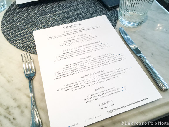 Além disso, durante a semana há um buffet de saladas bem farto que inclui sopas, queijos, frios, frutos do mar, omeletes e sobremesas. Aos domingos, como é tradição em inúmeros restaurantes de Toronto, o Colette serve um delicioso brunch. Escolhi o buffet de saladas, pois as opções me encheram os olhos, principalmente as sobremesas. Por $25, achei que valeu a pena.