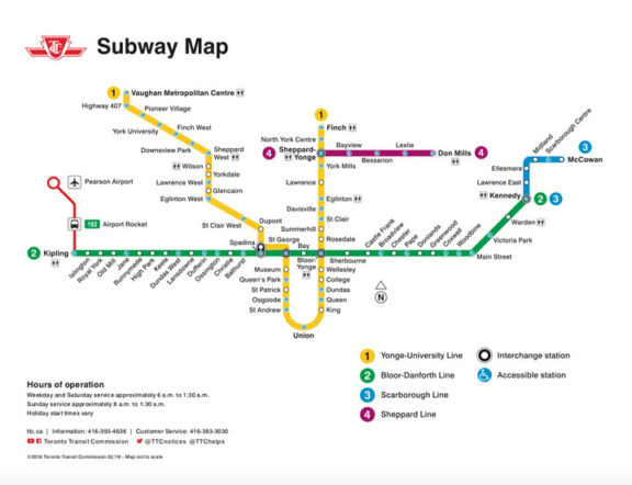 O metrô de Toronto funciona diariamente de 6am às 1:30am e a partir das 8am aos domingos. No total são 4 linhas de metrô e elas se conectam em alguns pontos.