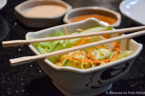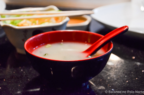 Enquanto assistíamos o show, eles serviram missô e uma salada deliciosa.