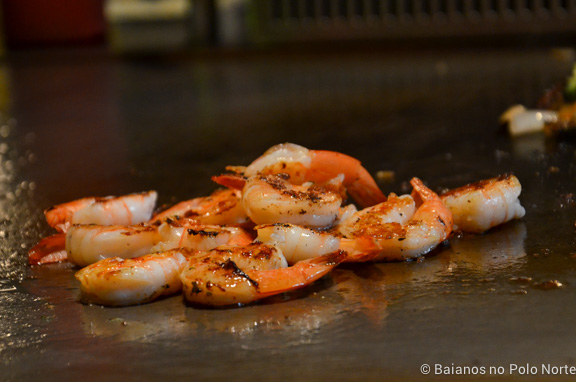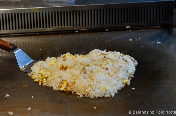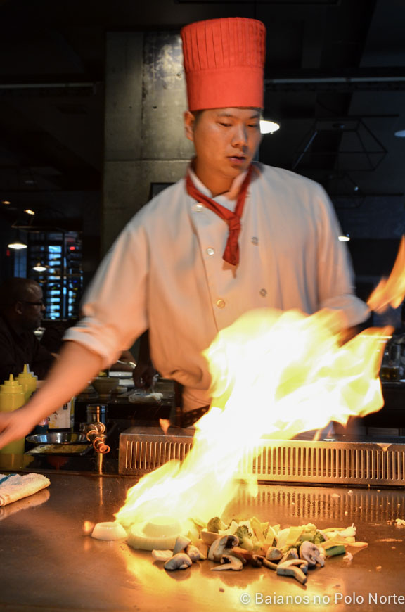 O nosso chef foi ninguém menos que um dos donos, o senhor Zee Zheng. Ele nos contou que é preciso treinar no mínimo 6 meses para poder conseguir fazer tudo que ele faz. E eu acredito, porque ele deu um show, fazendo malabarismos com os utensílios de cozinha antes de começar a preparar a comida. Coloquei um video no meu Instagram, passa lá e dá uma olhada (dá para ver mesmo se você não tiver conta no Insta). Esse ritual não foi especial para nós, é para qualquer pessoa que vai comer no Hibachi.