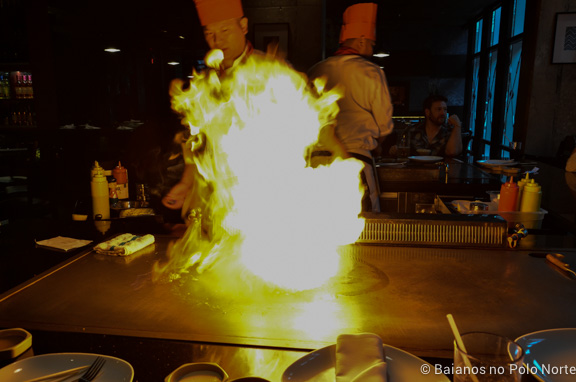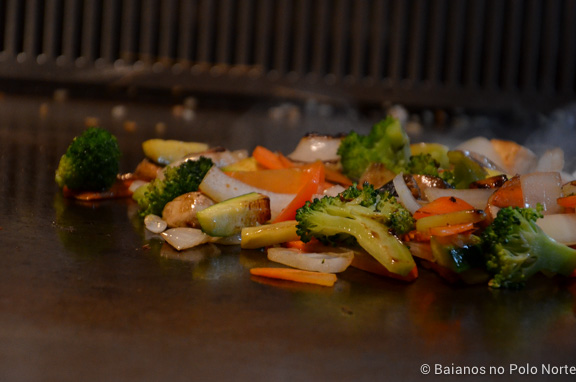 Depois ele joga os ovos para cima e com uma agilidade incrível, pega e quebra com a espátula. Tem outro video que fiz aqui. Depois ele faz um vulcão com cebolas e começa a adicionar os outros ingredientes da refeição. O legal é que o show vai ser diferente dependendo do prato que pedirmos, então cada vez que visitarmos o Hibachi, seremos surpreendidos com alguma coisa.