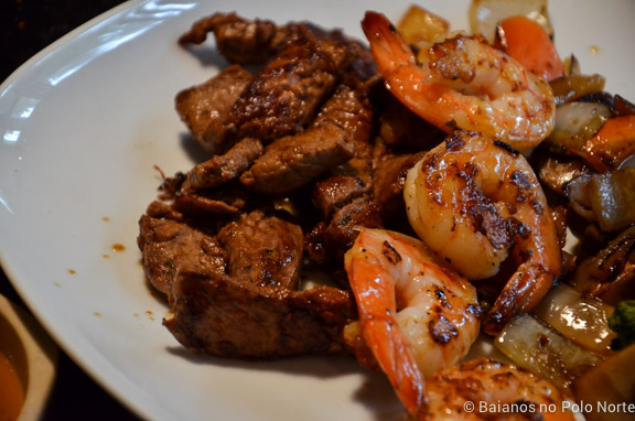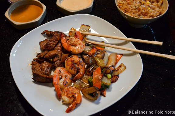 No menu, nós três pedimos a opção Two different Itens of your Choice ($20). Escolhemos filé mignon (+$5) e camarões. As verduras, a sopa, a salada e o arroz branco acompanham o prato e não custa nada a mais. Ao invés do arroz branco nós pedimos um arroz frito (+$3). Além dos acompanhamentos, ainda servem dois molhos deliciosos, um de gengibre e outro de maionese. Eu fiquei louca pelo de gengibre! Coloquei na carne, no camarão e ainda despejei o resto no arroz.